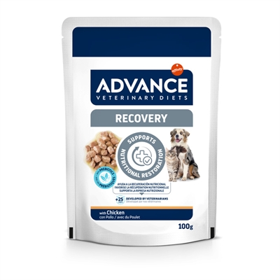 Advance Veterinary Diet Dog/Cat Recovery Herstel 11X100 gr is een compleet (volledig) dieetproduct voor honden en katten met een hoog energiegehalte, hoog gehalte aan essentiële voedingsstoffen en goed verteerbare ingrediënten. Hierdoor draagt de voeding bij tijdens het medische herstel.